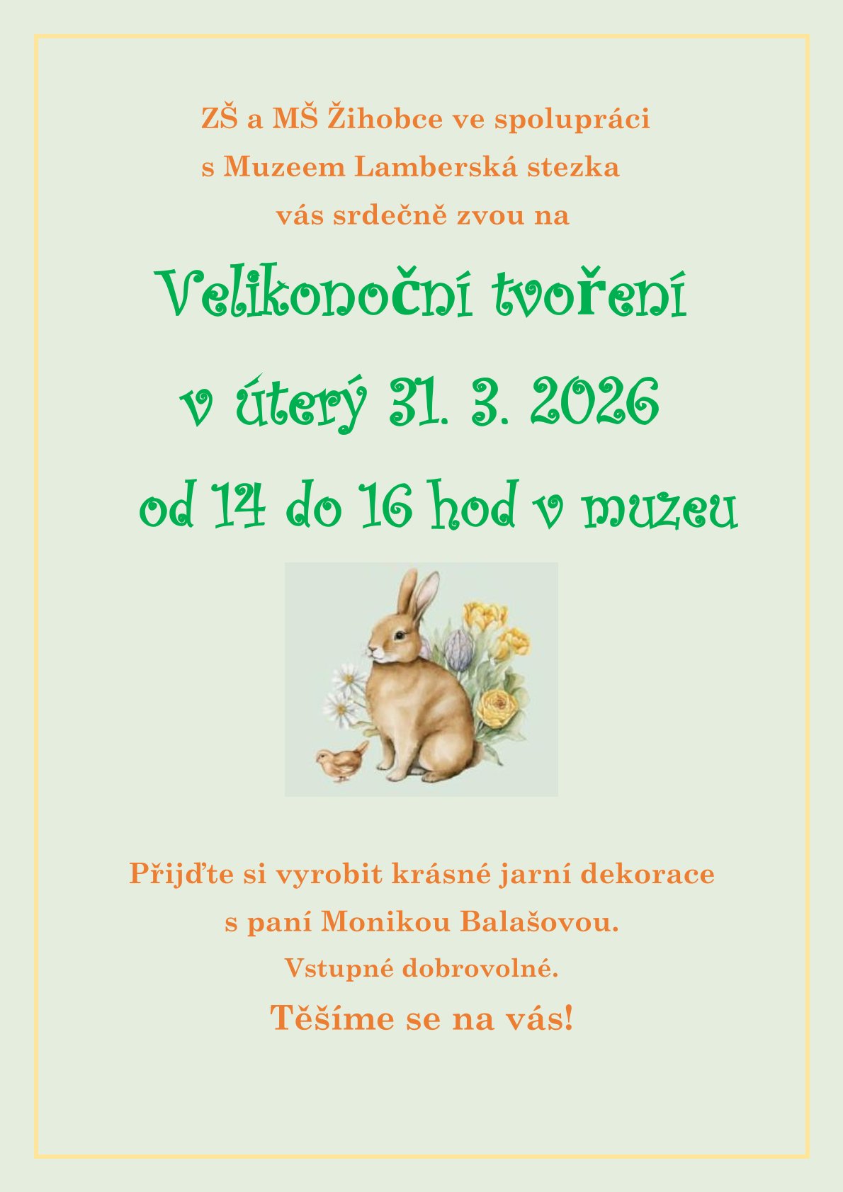 Přijďte si vyrobit krásné jarní dekorace s paní Monikou Balášovou. Vstupné dobrovolné.